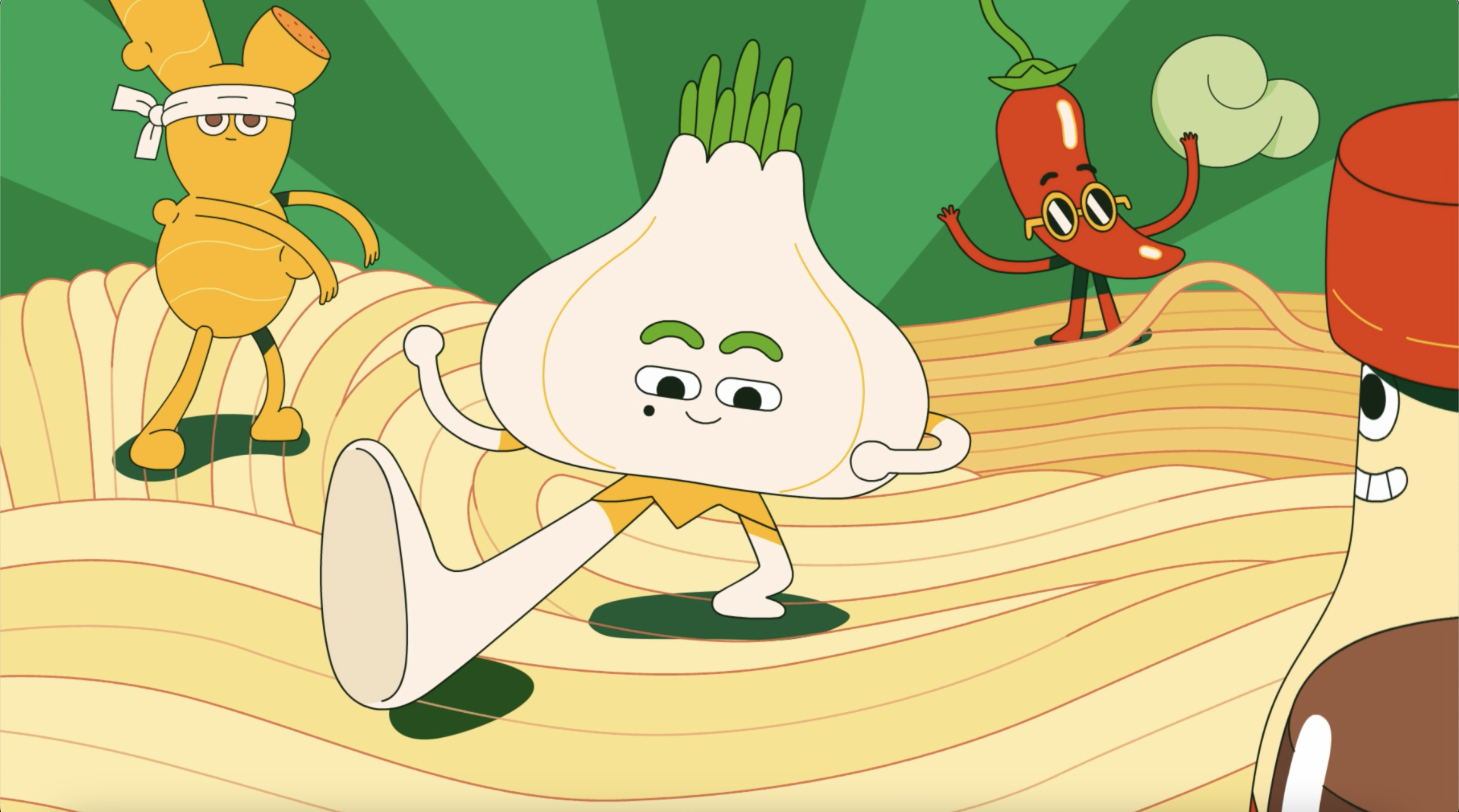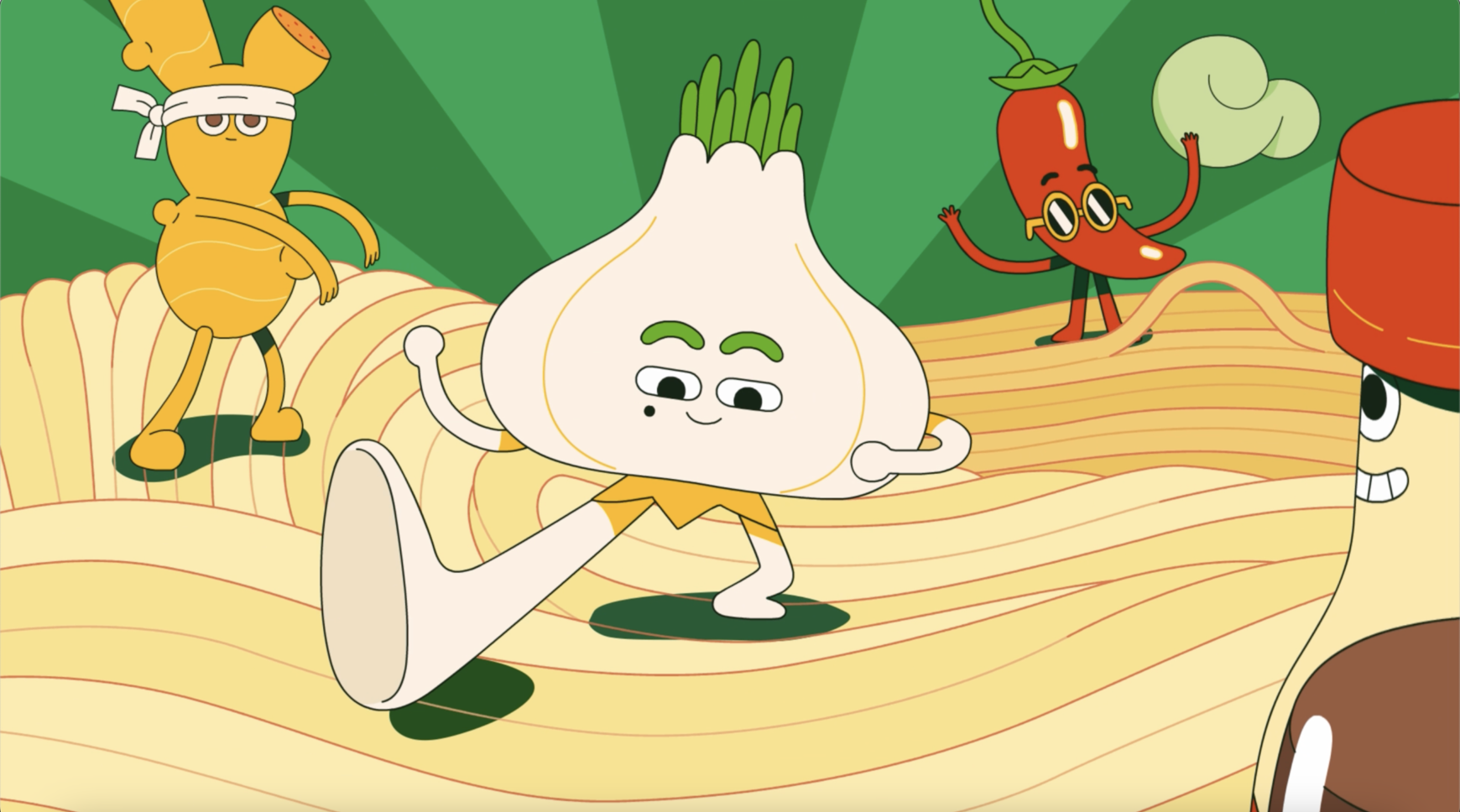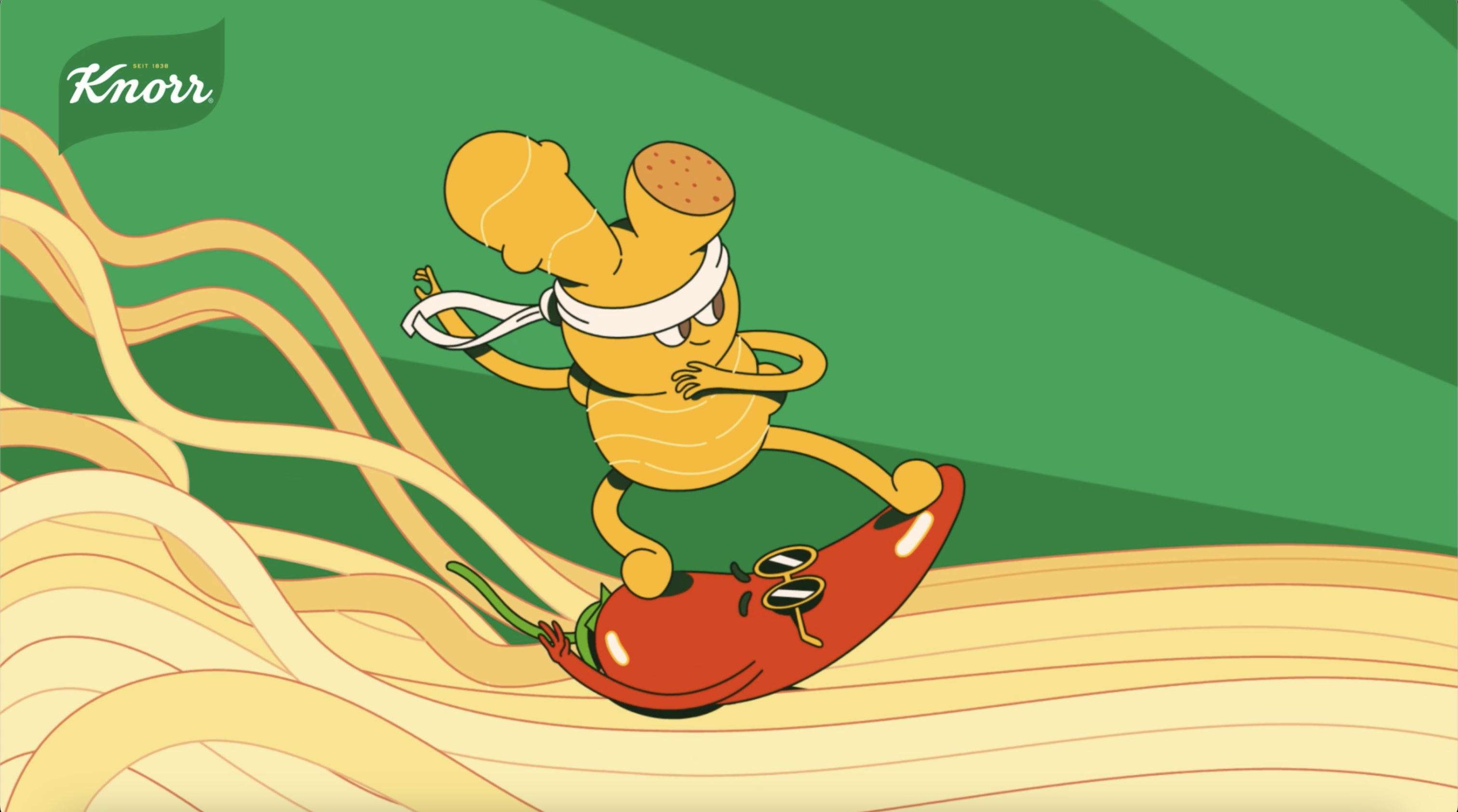 In four spots ranging from 6s to 15s, the fun-loving foodstuffs surf, dive, breakdance and bob among the noodles that fill the pack world. These amigos are the life of the party, with a unique sense of character infused in each. The four are easily recognisable as simple, synthesized forms of the produce they personify.